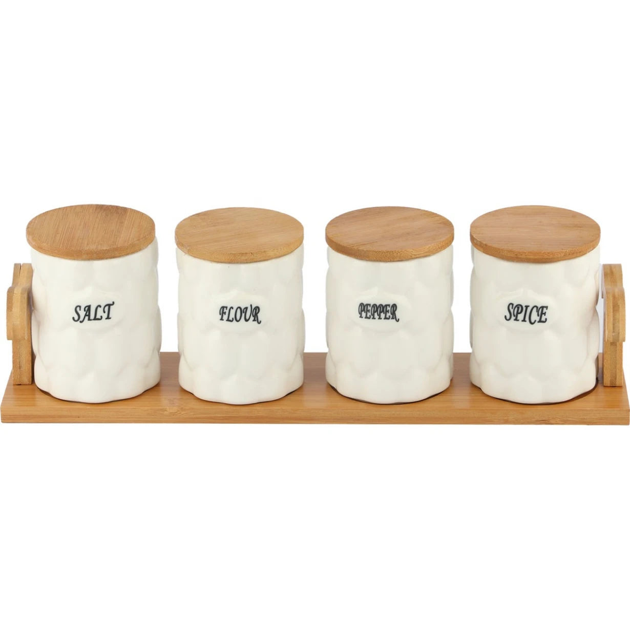 طقم علب بهارات سيراميك 4 علبة بغطاء خشب مع استاند