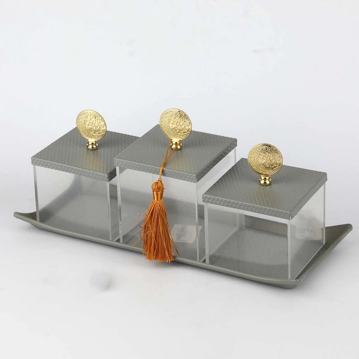 طقم تقديم مكسرات 3 علب مربع اكرلك بطوفرية الاستيل رصاصي