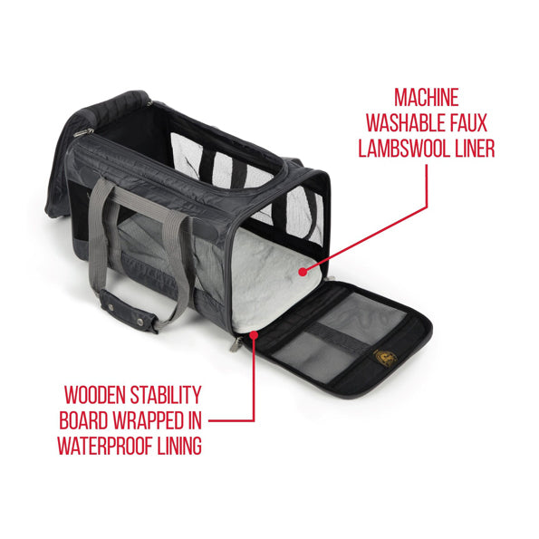 - Las entradas superiores y laterales facilitan la carga de mascotas cómodamente.