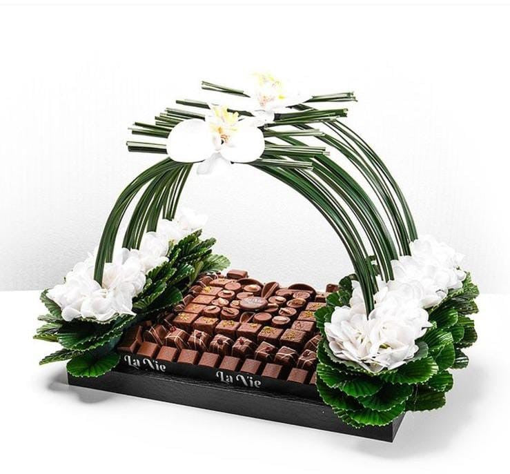 الشوكولاتة المستخدمة في الصواني تُعد فاخرة وتناسب تقديم الهدايا . تشمل أنواعًا مختلفة من الشوكولاتة