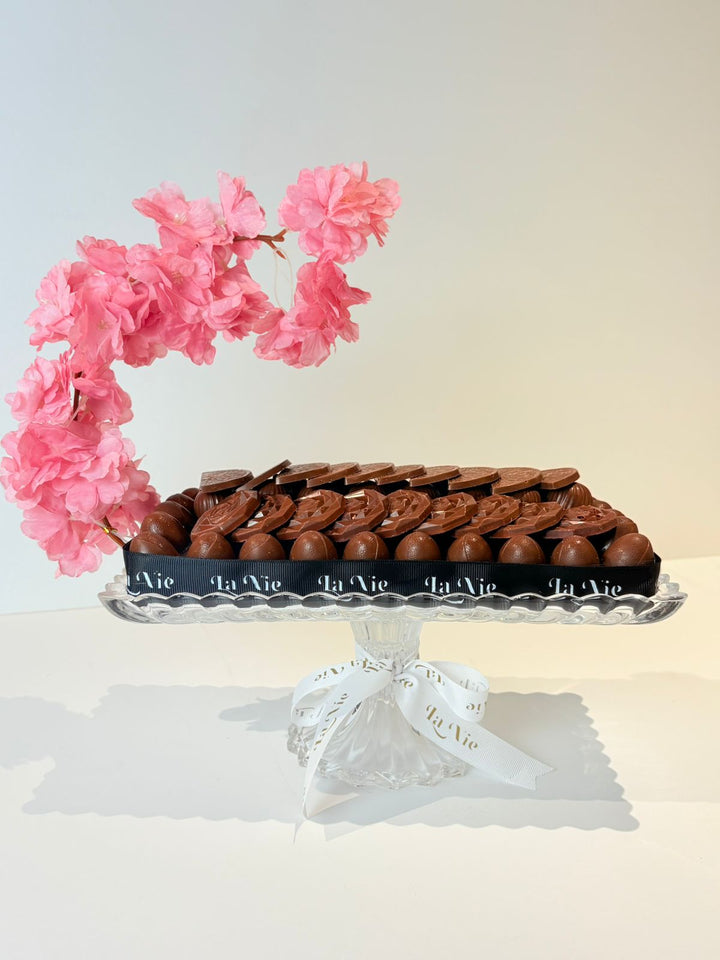 الشوكولاتة المستخدمة في الصواني تُعد فاخرة وتناسب تقديم الهدايا . تشمل أنواعًا مختلفة من الشوكولاتة