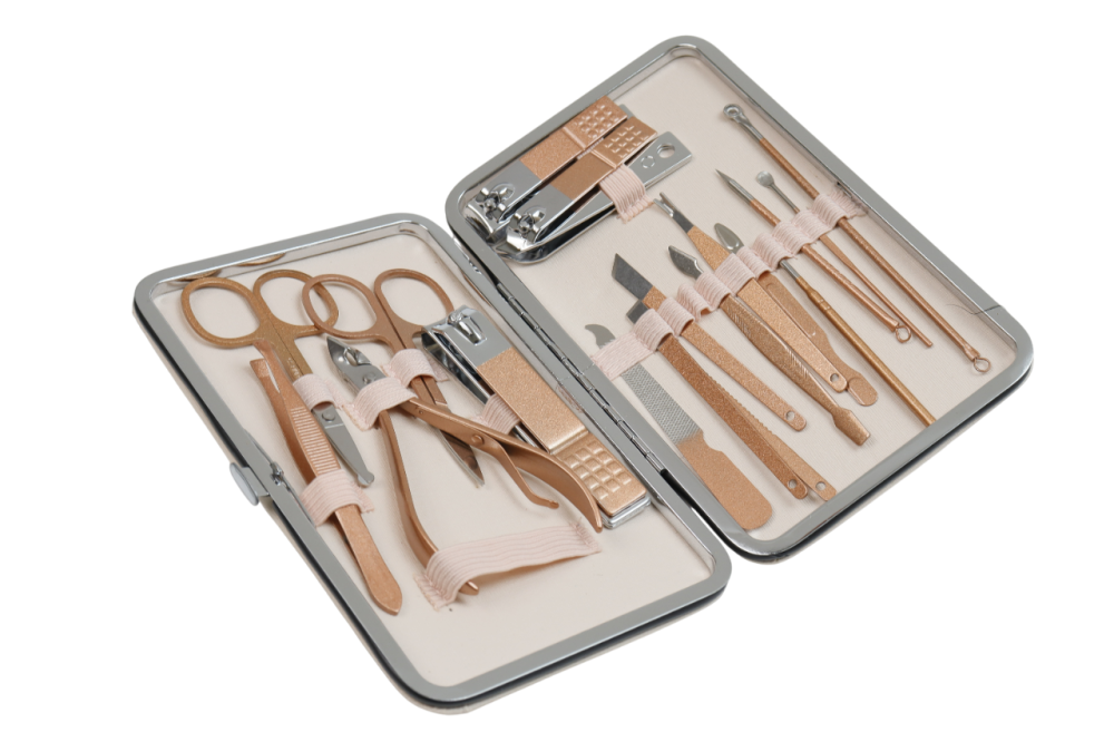 नाखूनों, हाथों और पैरों की देखभाल के लिए एक संपूर्ण प्रणाली, जिसमें शामिल हैं: जंग-प्रतिरोधी स्टेनलेस स्टील से बने पेशेवर उपकरण , जो सुनिश्चित करते हैं बेहद टिकाऊ और सटीक, सुरक्षित शेव । उपकरण के अंदरूनी भाग में आकर्षक सुनहरा रंग है। एक शानदार और व्यावहारिक बॉक्स , यात्रा या रोजमर्रा के उपयोग के लिए आदर्श।