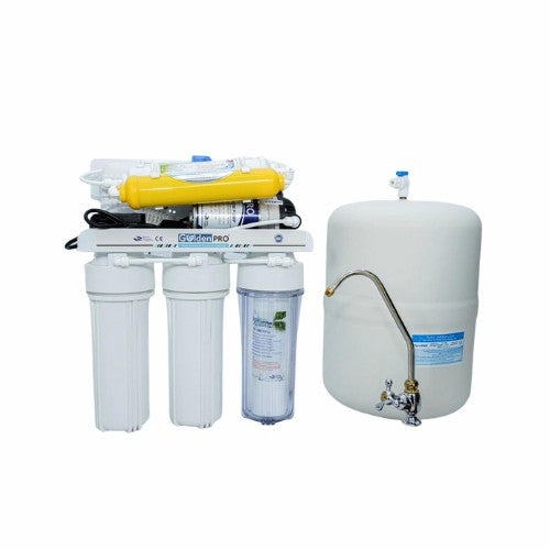| छह चरण घरेलू अलवणीकरण संयंत्र. 2 साल की वारंटी प्रतिदिन 300 लीटर अलवणीकृत जल उत्पादन क्षमता, जो 16 बड़ी बोतलबंद पानी की बोतलों (जेरी कैन) के बराबर है। जल विलवणीकरण प्रक्रिया को तीव्र करने के लिए 130 PSI क्षमता वाला शक्तिशाली पंप। ताइवान में निर्मित उत्पाद 19L फाइबरग्लास टैंक 1/4" क्रोम नल चरण 1 (कपास फिल्टर): इसमें पॉलीप्रोपीलीन से बनी एक कपास की मोमबत्ती होती है जो 5 माइक्रोन तक शुद्धिकरण करती है तथा रेत, कीचड़ और शैवाल जैसी ठोस अशुद्धियों को हटाती है। चरण 2 (दानेदार कार्बन फिल्टर): तापीय रूप से सक्रिय कार्बन से निर्मित इसका कार्य पानी में घुली गैसों को हटाना तथा पानी से क्लोरीन, स्वाद, गंध और रंग जैसे अवांछित पदार्थों को हटाना है। चरण 3 (ठोस कार्बन फिल्टर): 1 माइक्रोन छिद्रों वाले कार्बन स्टील से बने इस उपकरण का कार्य पानी के चौथे चरण में प्रवेश करने से पहले छोटी-छोटी अशुद्धियों को हटाना है। चरण 4 (नमक फिल्टर): यह एक इकाई है जिसे झिल्ली के नाम से जाना जाता है। इसमें 0.00001 माइक्रोन तक के बहुत महीन और संकीर्ण छिद्र होते हैं और यह रिवर्स ऑस्मोसिस गुण पर निर्भर करता है और लवण, बैक्टीरिया और भारी धातुओं को हटाता है, 96% से शुरू होने वाली निष्कासन दर को यांत्रिक निष्कासन कहा जाता है जिसमें किसी भी रसायन का उपयोग नहीं होता है चरण 5 (पोस्ट कार्बन फ़िल्टर): नारियल के खोल से बना कार्बन फिल्टर पानी को टैंक में जमा करने के बाद किसी भी अप्रिय गंध या स्वाद को दूर कर देता है। चरण 6 (खनिज): ज्वालामुखीय चट्टानों का एक समूह जिसमें कैल्साइट इकाई होती है जो शरीर को आवश्यक खनिजों के साथ पानी की आपूर्ति करती है। |
