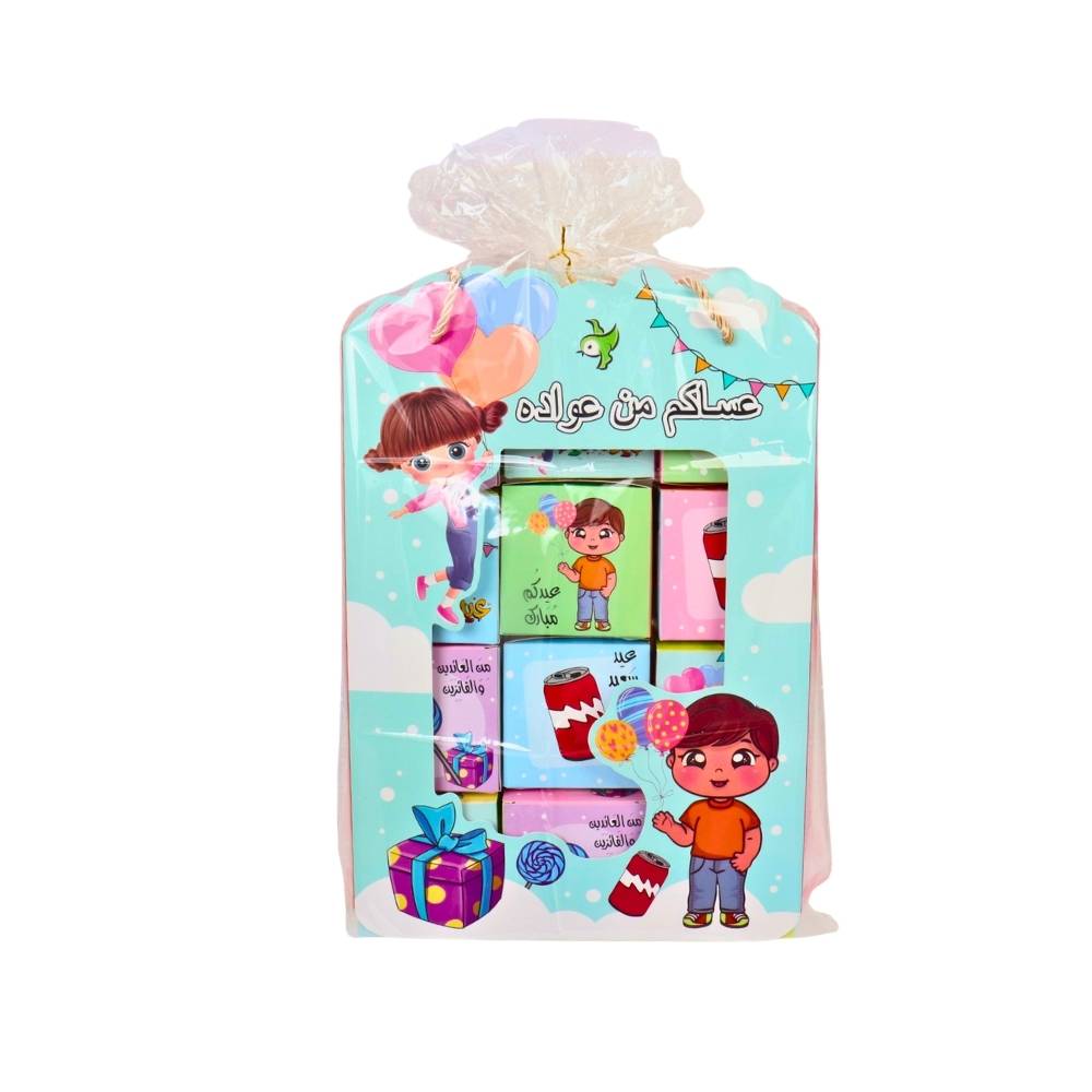 توزيعات هدايا بتصميم مبهج ورسومات كرتونية ملونة تناسب الأطفال، تحتوي على مكعبات قابلة للترتيب بطبعات تهنئة وأشكال لطيفة. مناسبة لتقديمها في الأعياد والمناسبات السعيدة وتضفي أجواء فرح وبهجة على الأطفال.
