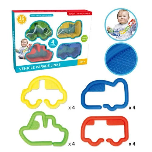 - اجمعها في سلسلة للحصول على لعبة عربة أطفال بسيطة أو منفصلة لألعاب التسنين المتعددة.