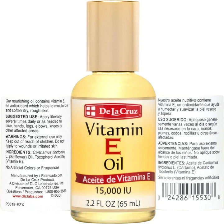 استعيدي نضارة بشرتك مع زيت فيتامين E من دي لا كروز: هذا الزيت الطبيعي الغني بفيتامين (E) هو سر للحصول على بشرة ناعمة ورطبة ومشرقة.