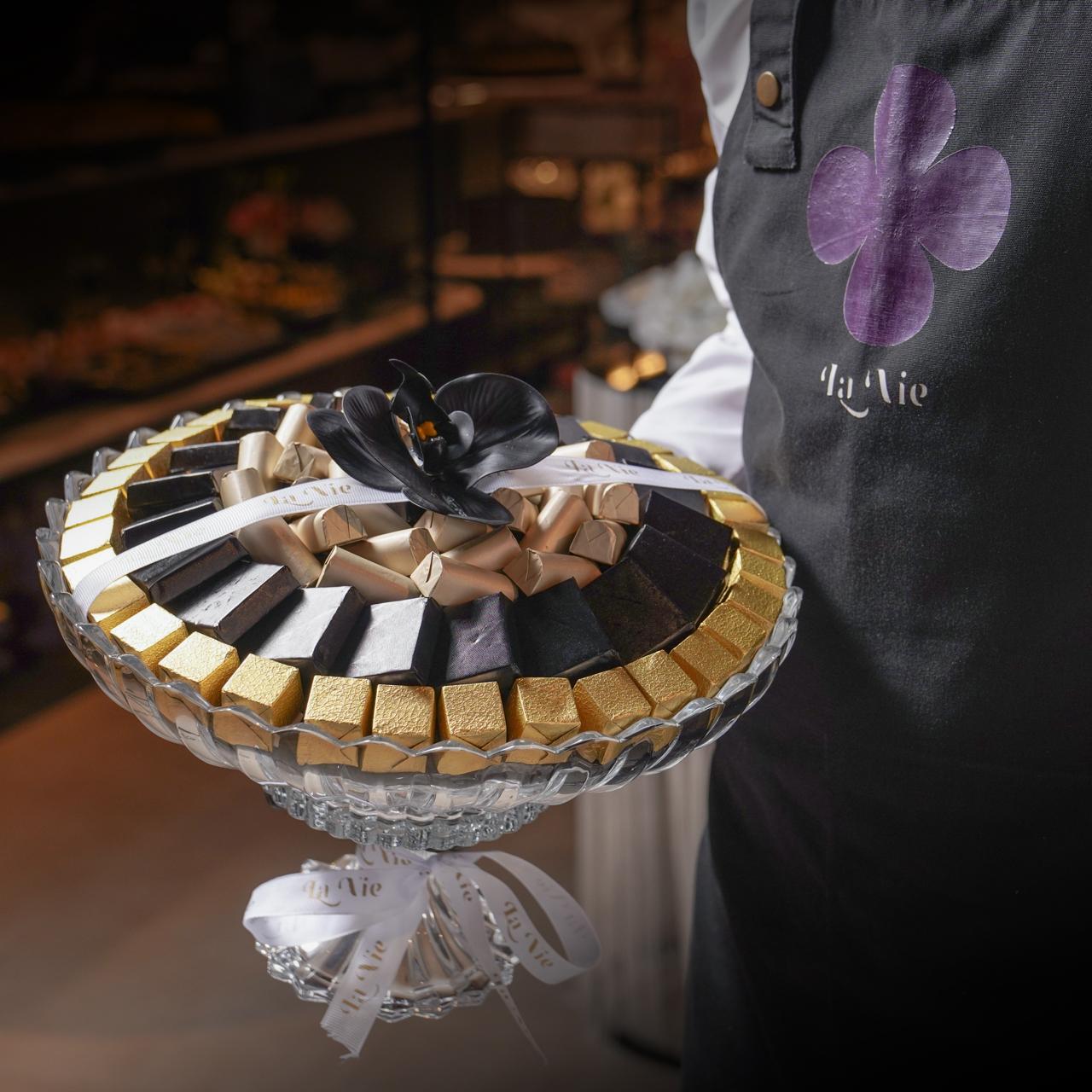 الشوكولاتة المستخدمة في الصواني تُعد فاخرة وتناسب تقديم الهدايا . تشمل أنواعًا مختلفة من الشوكولاتة