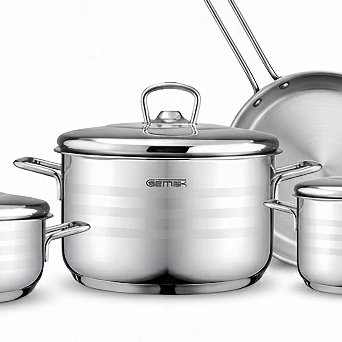 استمتعي بتجربة طهي متكاملة مع طقم قدور جيماك المصنوع من الستانلس ستيل عالي الجودة SS304، الذي يجمع بين المتانة والأداء المميز. يتميز الطقم بتوزيع حراري ممتاز وتشطيب خارجي لامع يمنح مطبخك لمسة عصرية أنيقة.