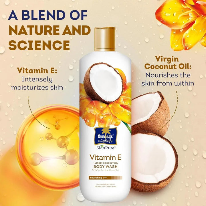دللي بشرتك بلمسة من الطبيعة مع غسول الجسم سكين بيور بفيتامين E من باراشوت.