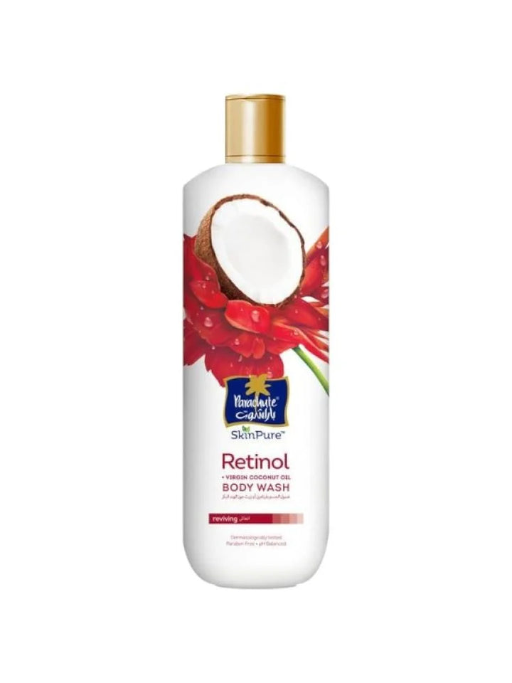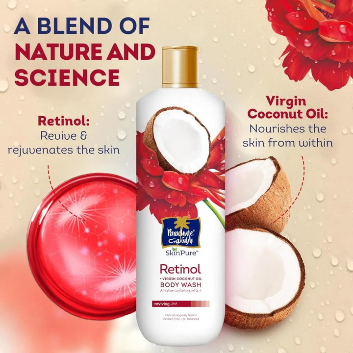 أنعش بشرتك يوميًا مع غسول الجسم سكين بيور بالريتينول وزيت جوز الهند البكر من باراشوت، لترطيب، تجديد ونضارة طبيعية تدوم طوال اليوم.
