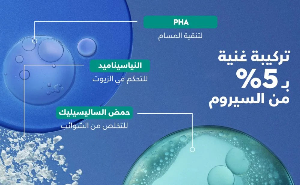 - تركيبة ميسيلار مع سيروم 5%: تحتوي على PHA، حمض الساليسيليك، والنياسيناميد لتقليل الشوائب وتنقية المسام.