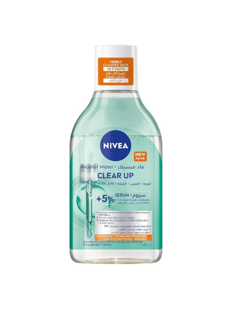احصلي على بشرة نقية ومشرقة مع نيفيا ماء ميسيلار كلير أب +5% سيروم، المنظف اليومي الذي يزيل المكياج والشوائب بلطف ويترك بشرتك صافية ومرتبة في 7 أيام.