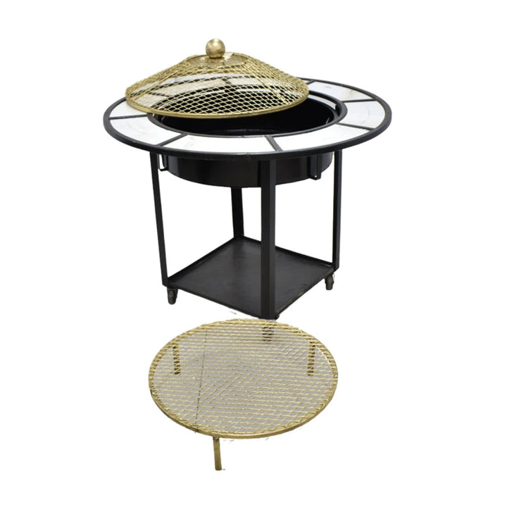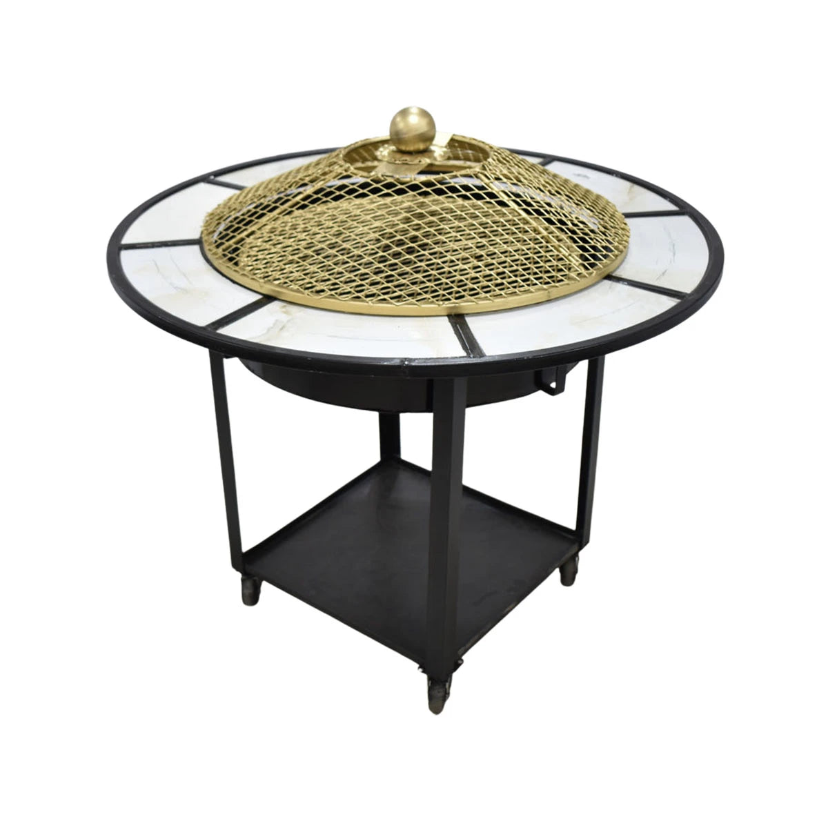 منقل شواء معدني بحواف رخام و بمساحة داخلية عميقة مزود بغطاء شبك للحماية ولتغطية المنقل بعد الاشعال و بعجلات لسهولة الحركة والتنقل .