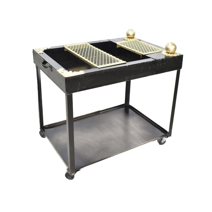 منقل شواء معدني بلون اسود ونقش وزخرفة ذهبية مع عجلات لسهولة الحركة والتنقل .
