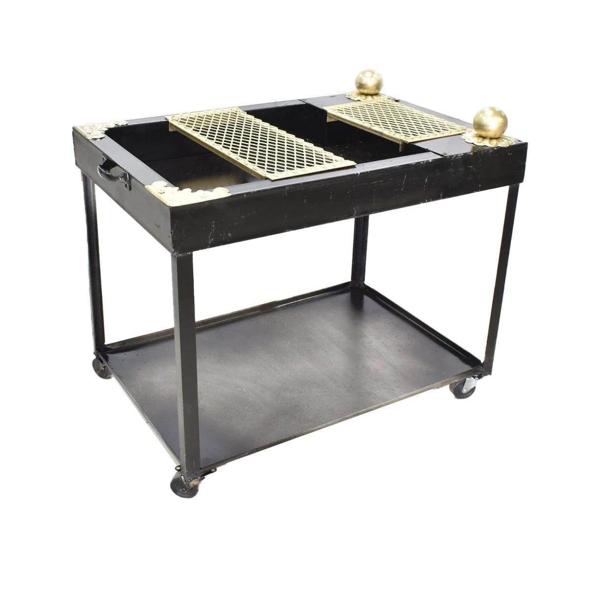منقل شواء معدني بلون اسود ونقش وزخرفة ذهبية مع عجلات لسهولة الحركة والتنقل .