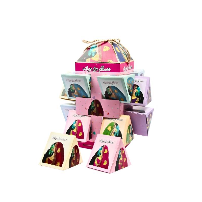 توزيعات عيد كرتونيـة استـاند يحتوي علي 12 بوكسات وسط ملونه شكل هندسي مثلث بتصميم رسومات ولوحـات ملونـه وعبارات عيديه مصمم بقاعـدة مرنـه سهله اللـف والدوران