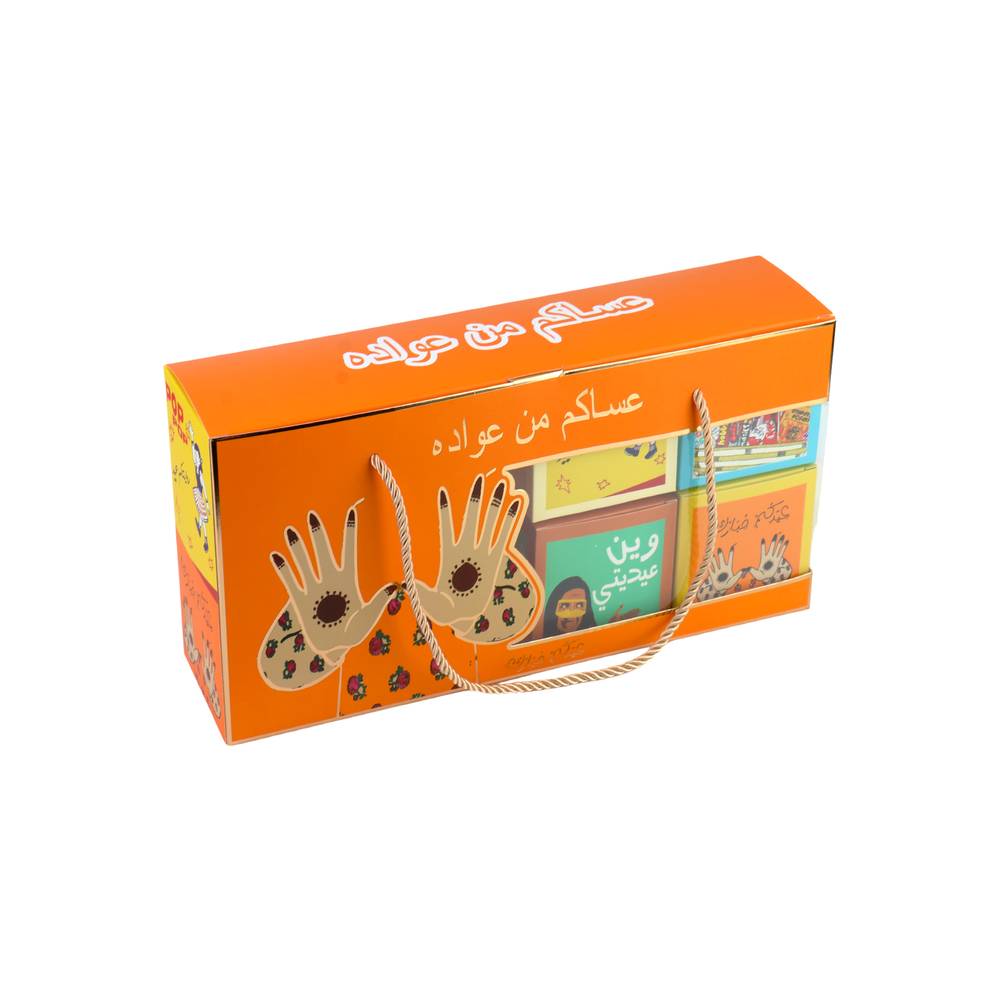 توزيعات عيد كرتونية 5 قطعة ألــوان وتصاميم مختلفـة تناسب الأولاد والبنات داخل المغلف حامل ورقـي كبير يتم وضع العلب داخلة بتصميم خزانــةمع 4علب مربعــة صغيـرة